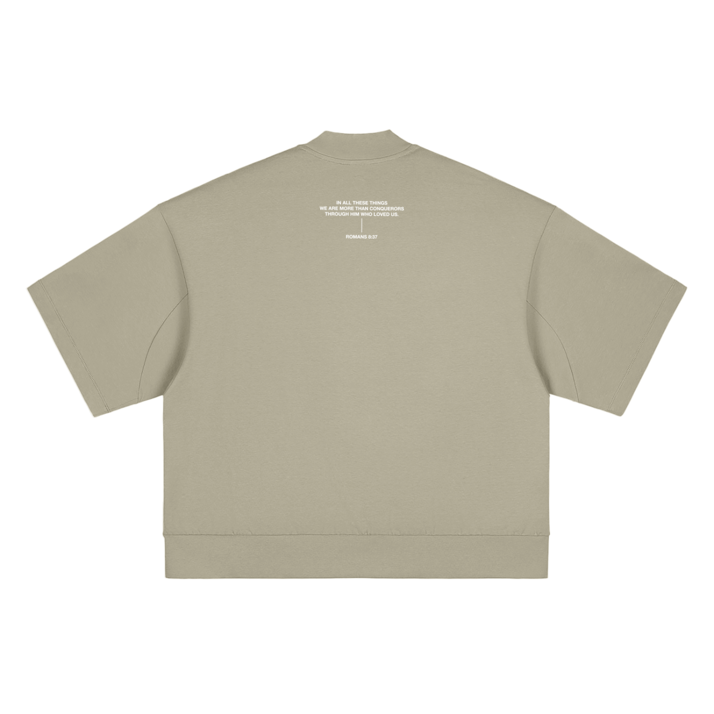 Crafted from 280GSM heavyweight cotton with clean, structured half sleeves. Built for durability and offers a relaxed boxy fit with a raw-edge hem that holds its shape wear after wear.