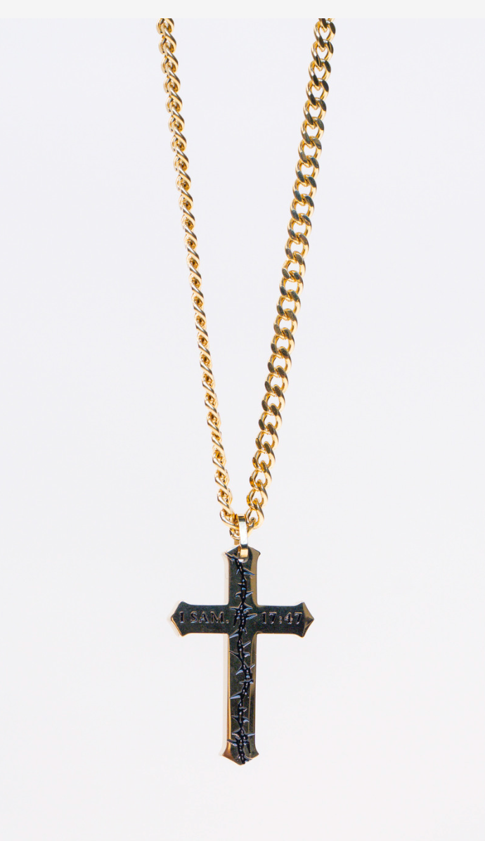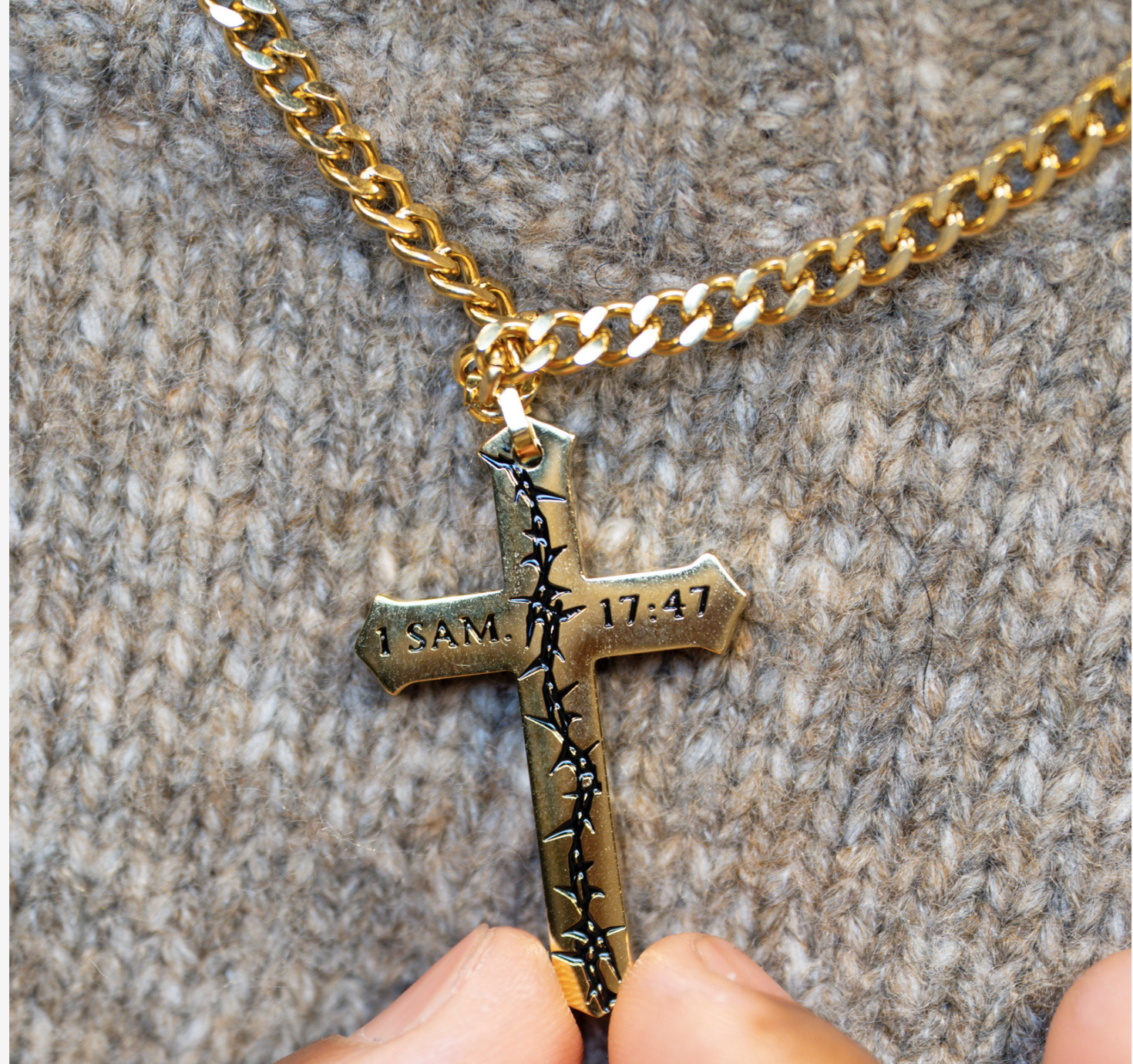 Description: Carry the weight of redemption with this meaningful gold-tone necklace featuring