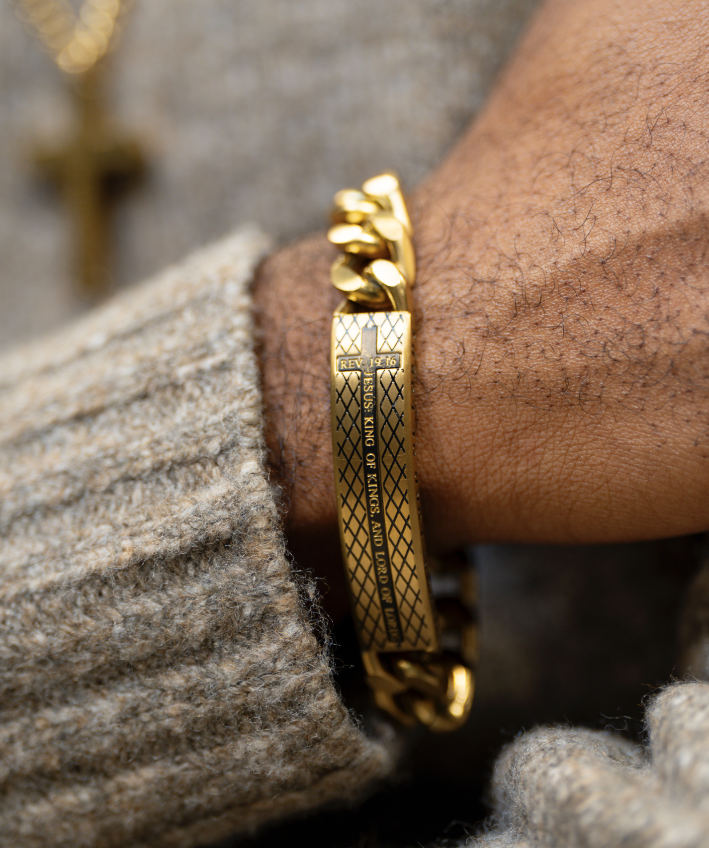 “King of Kings” message. The architectural crown design pairs perfectly with our bracelet while